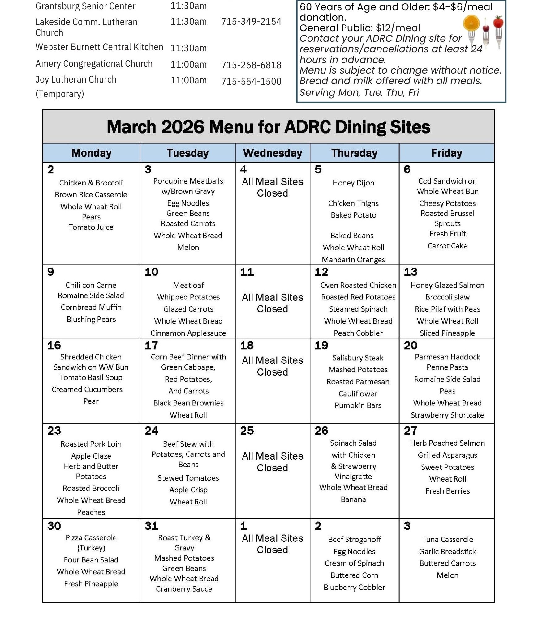 The ADRC Dining Program provides a nutritious meal and an opportunity to dine and socialize with new and old friends. There are five dining locations throughout Polk and Burnett Counties, and they are listed below. All are welcome to enjoy delicious lunch Mondays, Tuesdays, Thursdays, and Fridays. Each meal provided meets one-third of the recommended daily dietary allowances and includes meat or other protein, two servings of vegetables, one serving of fruit, bread, dessert, and milk.