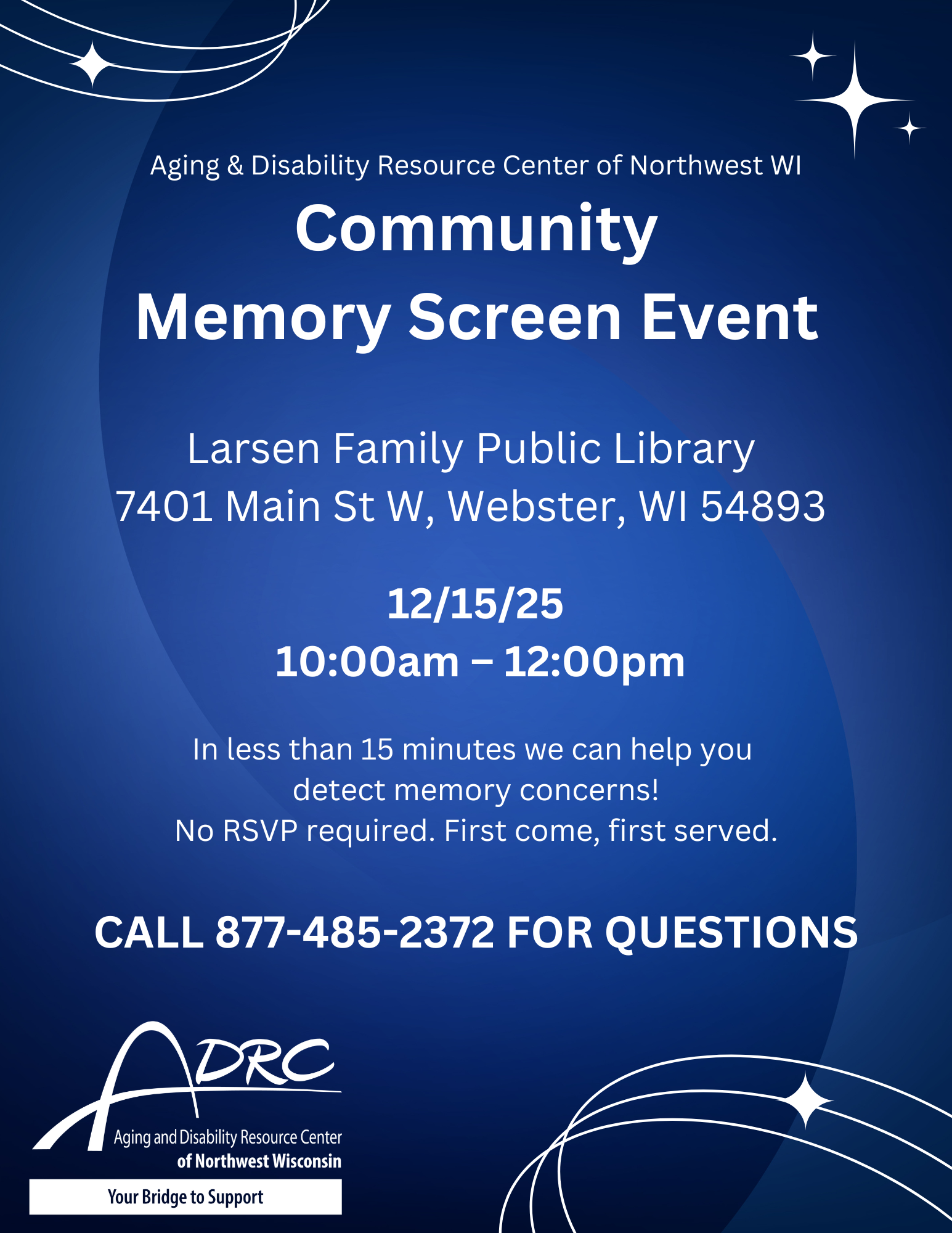 Memory Cafe starting April 2025 at the Amery Community Center for caregivers and their loved ones with dementia. First Wednesday of every month 12:30 to 2:00pm. Call 877-485-2372.